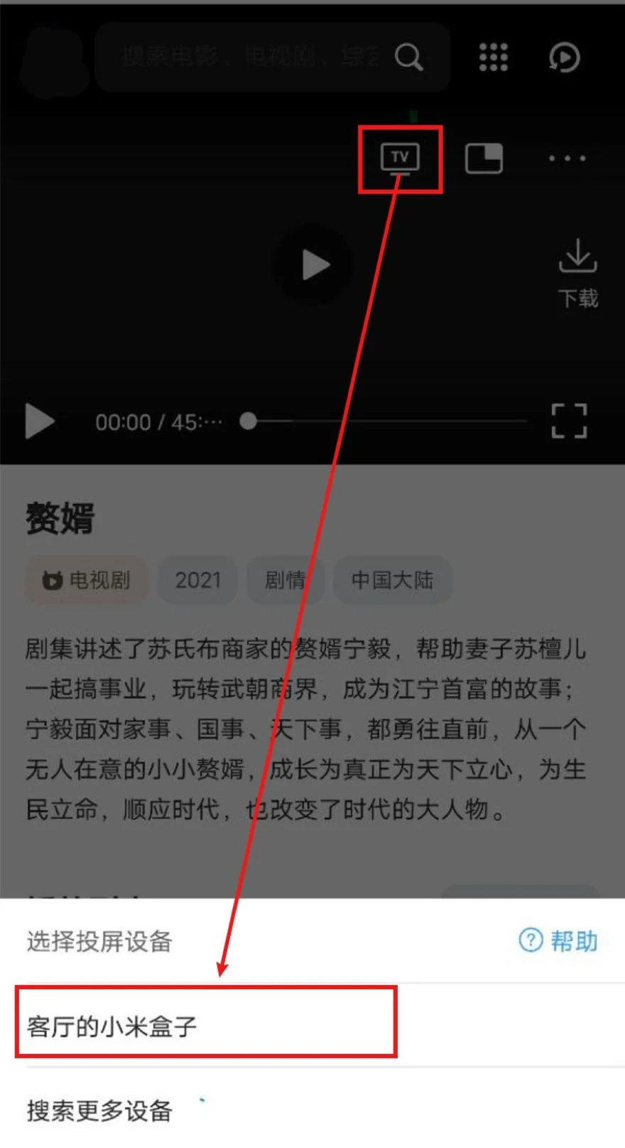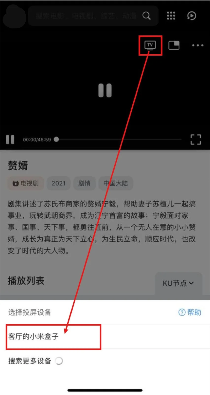 打开QQ浏览器(会接管网页播放器)->打开我要4K->播放视频->选中投屏图标->等待搜寻出智能电视/电视盒子->选中,即可投屏。